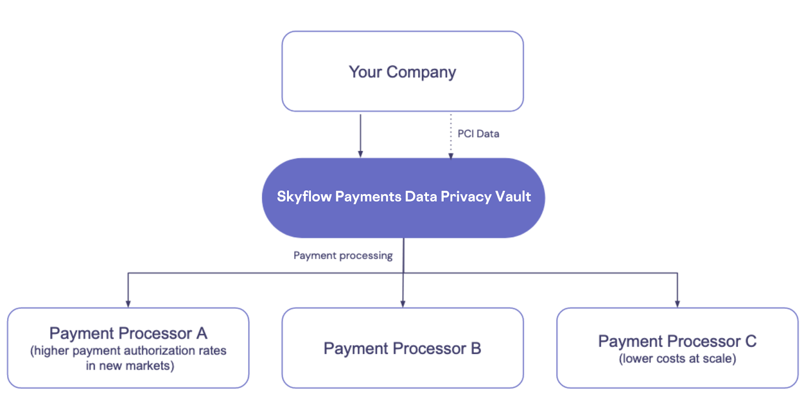 As your company grows and your PCI compliance requirements increase, you can continue using Skyflow to protect PCI data while gaining the flexibility to orchestrate payments across vendors. With payment orchestration, you can expand profitably into new markets and recover from payment vendor outages.