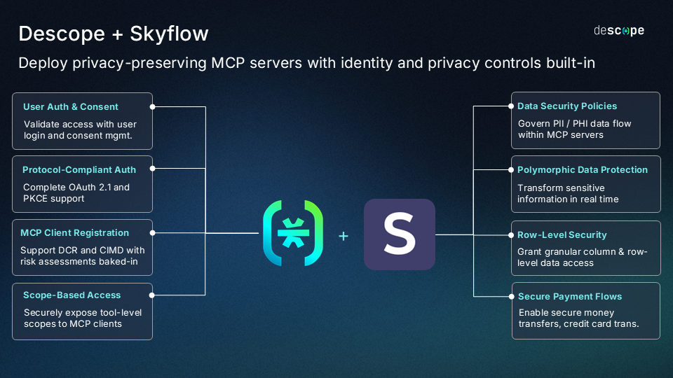 Descope and Skyflow have joined forces to offer the first natively integrated identity and data control layer for organizations building external and internal-facing MCP servers. With Descope acting as the authorization server and Skyflow providing runtime data security, customers can now deploy MCP servers with user authentication and consent, scope and tool based access control, and enterprise-grade privacy guardrails.