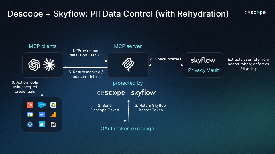 - With this configuration in place, Descope’s authentication and access management capabilities work in concert with Skyflow’s data protection capabilities to offer end-to-end identity and privacy protection for any MCP server data flow.