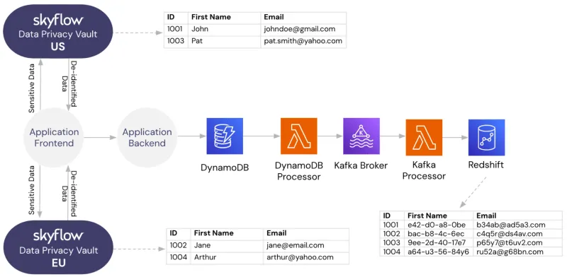 - The EU-based customerโs sensitive PII is stored in the EU-based data privacy vault, and Skyflow responds with de-identified data.
