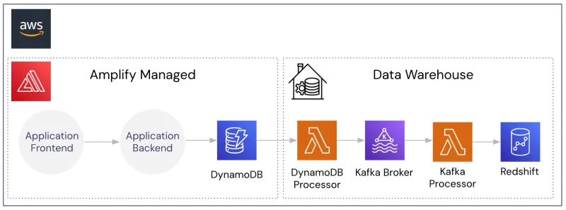 Letโs assume we have a simple application infrastructure as shown below with AWS Amplify providing the web server infrastructure, DynamoDB for application storage, and Redshift for warehousing.