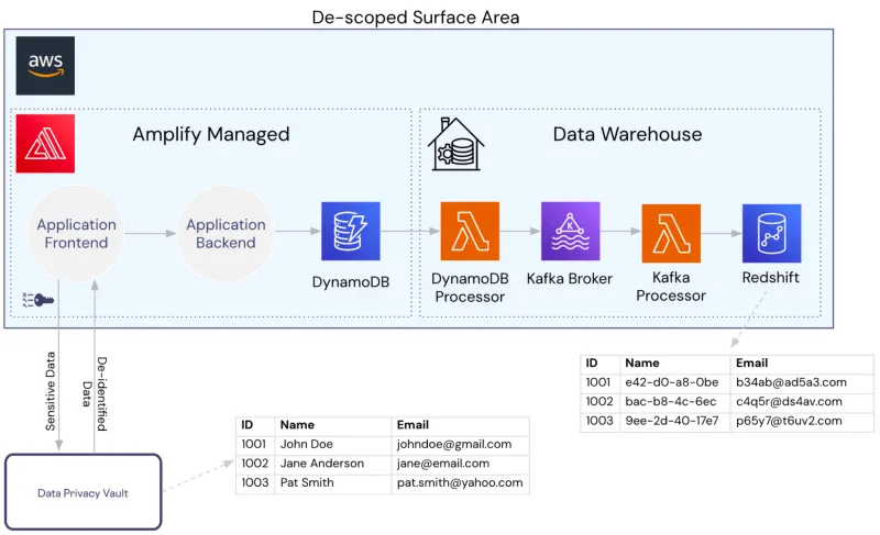 By introducing the vault as shown below (in this example, the collection of PII is handled directly from the vault), we de-scope all our AWS services. The services are only ever handling de-identified data, including the warehouse.
