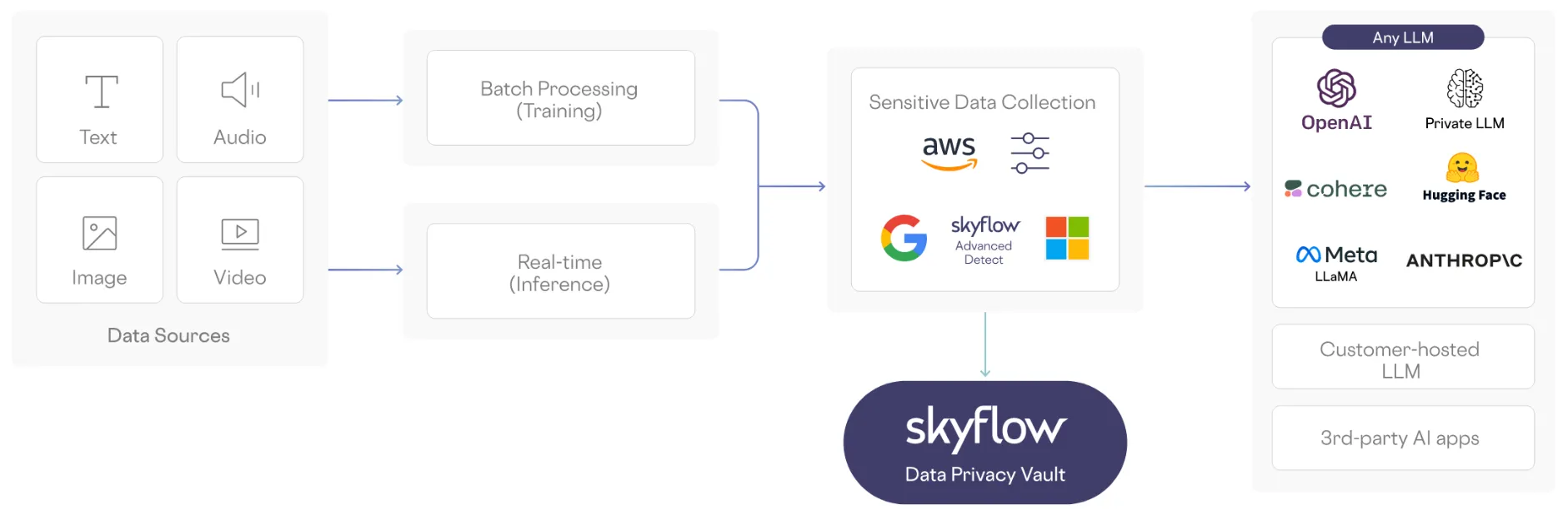 - Integrated Compute Environment: Skyflow LLM Privacy Vault seamlessly integrates into existing data infrastructure to add an effective layer of data protection. Skyflow LLM Privacy Vault protects all sensitive data by preventing plaintext sensitive data from flowing into LLMs, and only reveals sensitive data to authorized users as model outputs are shared with those users.