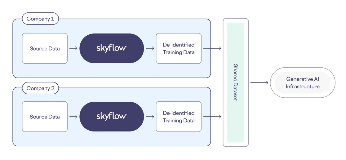 - Multi-party Model Training: Skyflow supports multi-party training so that multiple parties (i.e., multiple businesses or individuals) can de-identify sensitive data from their datasets and then build shared datasets that preserve data privacy.