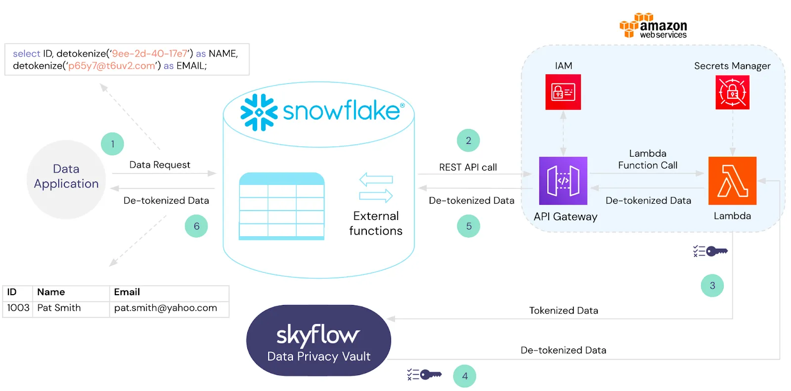 We can solve this by integrating the vault with the data warehouse. For example, in Snowflake, you can create an external function that securely calls detokenize as part of your query operation. The detokenize function automatically utilizes the built-in privacy and security features of the vault.