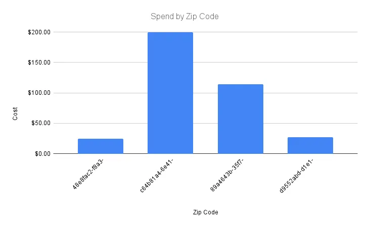 Using the data warehouse above, you can create the following visual representation of spending by geolocation. Without exposing any PII, you can verify the statistical significance of spending differences by customer location, as follows: