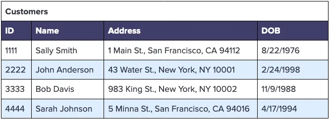 To see how you can preserve high data utility while using a data privacy vault to de-scope your analytics pipeline from compliance and data security concerns, let’s take a look at a specific example. Imagine that you manage a few types of sensitive customer data that you store in a Customers table, as follows: