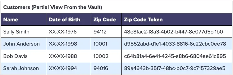This transformation is supported natively by the vault when the Date of Birth column is configured to mask the date to match our use case. By exposing only the year and redacting the remainder of each customer’s date of birth, we redact the data that would potentially identify an individual – so MM-DD-YYYY becomes XX-XX-YYYY.
