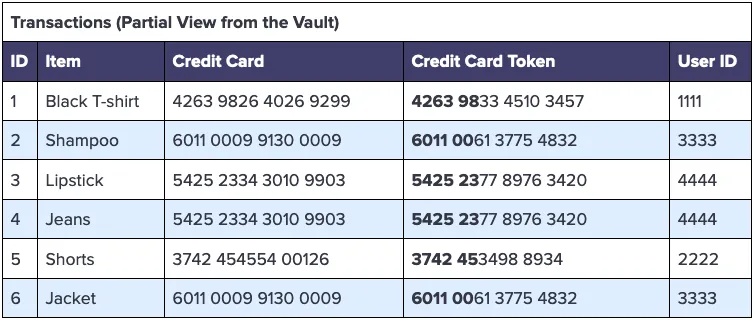 The first step to answering this question while protecting these credit card numbers is to store these numbers in the data privacy vault using a special deterministic BIN-preserving tokenization format. By applying this tokenization format to the credit card column for the vault Transactions schema, we get tokens that preserve the first six digits of the credit card, while substituting the remaining digits for random (tokenized) values, as follows: