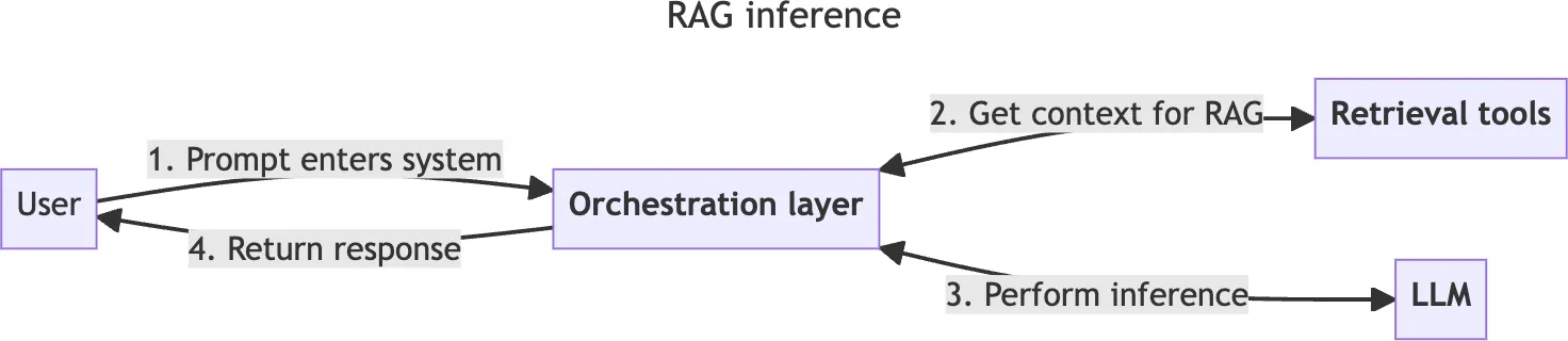 When users trigger your inference flow, the orchestration layer knits together the necessary tools and LLMs to gather context from your retrieval tools and generate contextually relevant, informed responses. The orchestration layer handles all your API calls and RAG-specific prompting strategies (which we'll touch on shortly). It also performs validations, like making sure you don't go over your LLM's token limit, which could cause the LLM to reject your request because you stuffed too much text into your prompt.