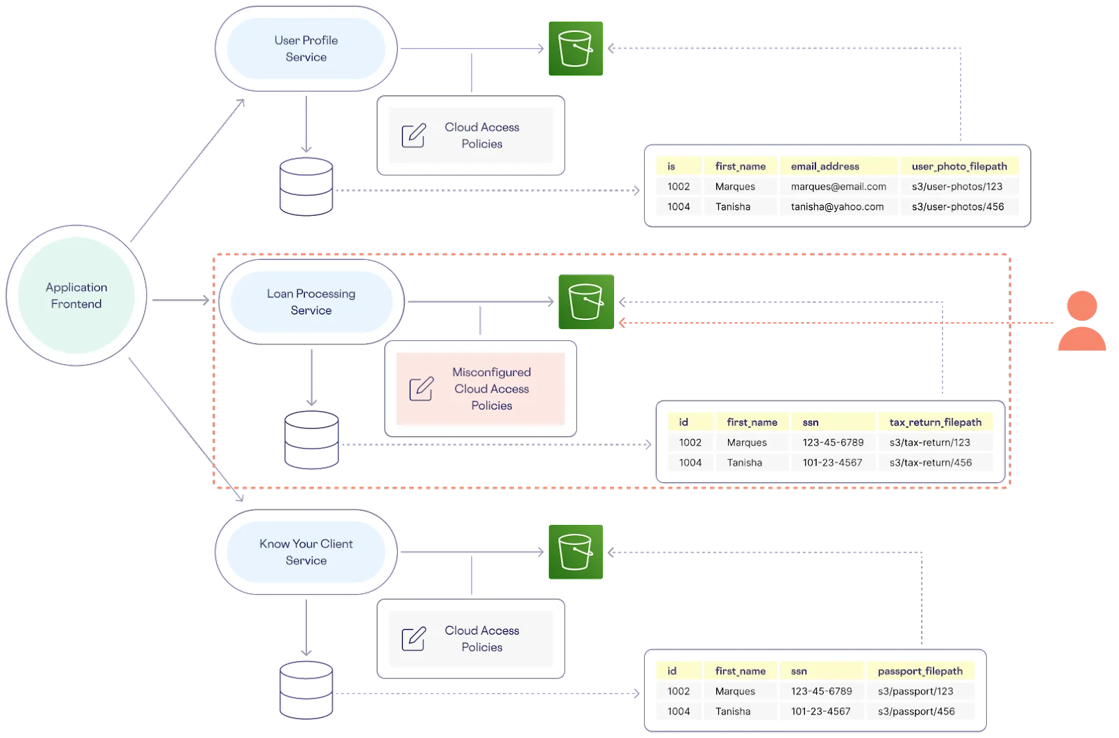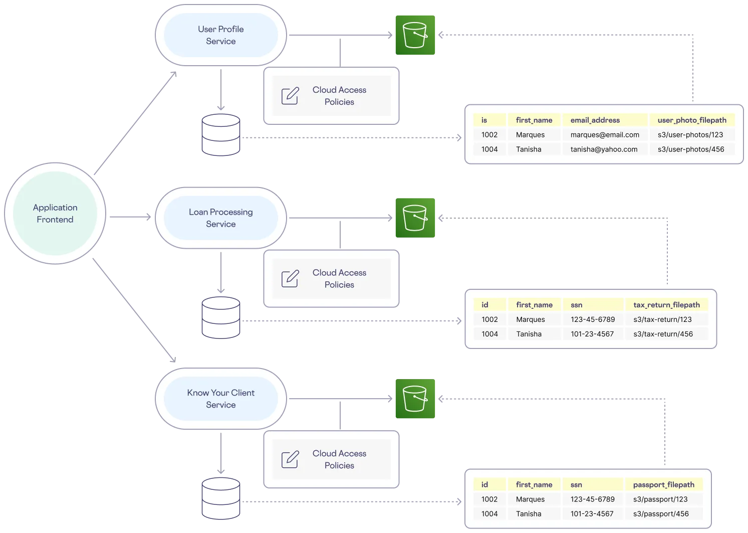 First, you need a user profile service that writes to, updates, and retrieves user data from a database and uses a cloud object storage solution such as AWS S3 to store uploaded profile pictures. Each user row in the database has a column pointing to the S3 location of a profile picture. To ensure even the most basic privacy for each user’s data, corresponding governance policies explicitly grant access between the different cloud resources.