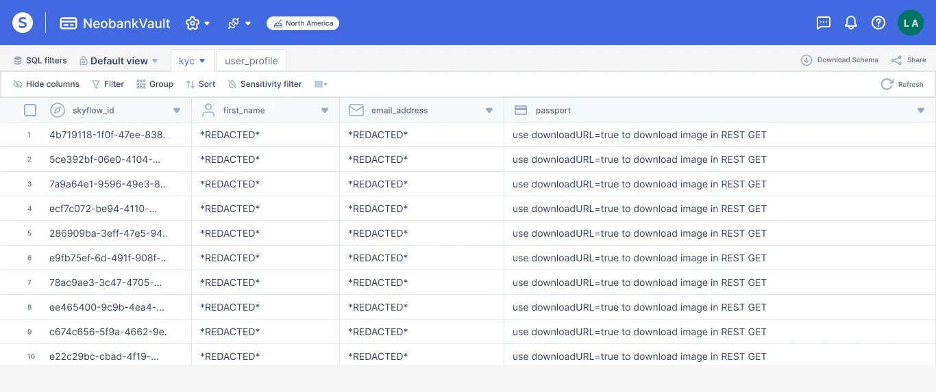 In this example, we have a vault schema that includes a column for a user’s passport image file. Skyflow Data Privacy Vault natively supports file data types. In other words, a user’s passport is stored as just another column in a row and not just a path to the file in an S3 bucket. This file data type can be redacted or masked, encrypted, and tokenized the same as any other data in the vault and access is controlled through a single set of policies.