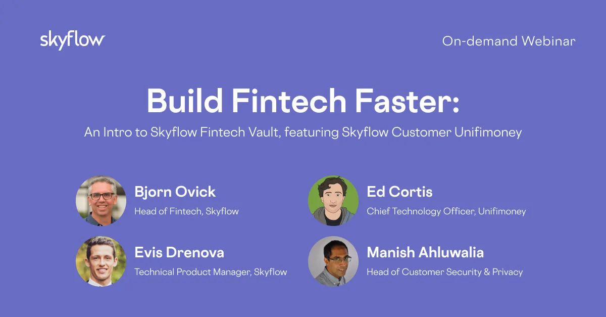 In the competitive world of Fintech, time to market matters more than almost anything. Anything except customer data privacy, security, and compliance, that is. A data breach or loss of customer confidence can kill your business before it even gets going. What if there was a better way? What if a polymorphically encrypted data privacy vault — the kind of solution giants like Apple, Google, and Goldman Sachs have built internally — was available to you via the cloud? What if privacy had an API? Let us introduce you to the Skyflow Fintech Data Privacy Vault, the industry’s first zero-trust data vault available as an API. Skyflow is the “Stripe for Sensitive Data” or “Plaid for PII", designed expressly for: